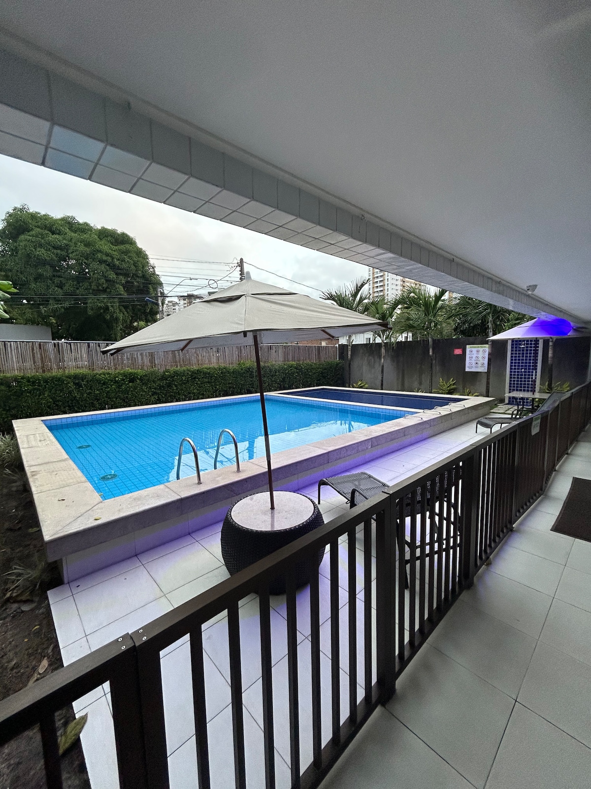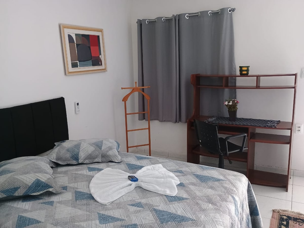 Espaço bem equipado com suíte. Possui ar condicionado, tv smart,frigobar,cama de casal e escrivaninha. Cozinha externa compartilhada, equipada com fogão, geladeira, mesa, cafeteira, sanduicheira, dentre outros. Tem churrasqueira com área aberta para lazer. A cozinha é bem equipada com o necessário para preparar suas refeições. O ambiente é tranquilo, familiar e muito bem localizado. Próximo ao aeroporto dos Guararapes, centro da cidade, cidade universitária, Boa Viagem, Olinda...