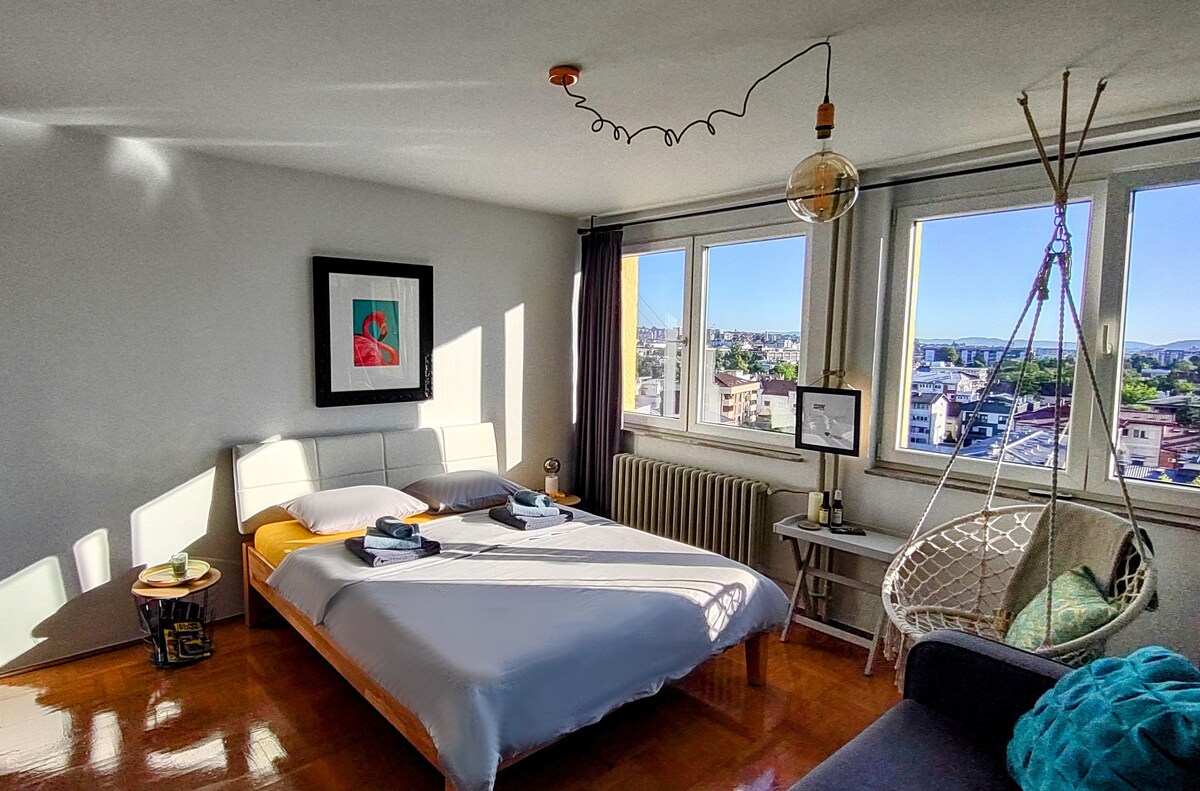 This unique and spacious, 90 square meters penthouse apartment, is centrally located at one od the most demanded neighbourhoods, safe, peacful and a 10 minute/800m walk to the heart of Sarajevo. It features 2 bedrooms, large bathroom, toilette, a modern large kitchen with all necessary amenities to make your stay convenient and pleasant. Newly refurbished, chic and has a lovely view of the city. During your stay, you can enjoy free WiFi, TV, AC, coffee machine and free parking on premises