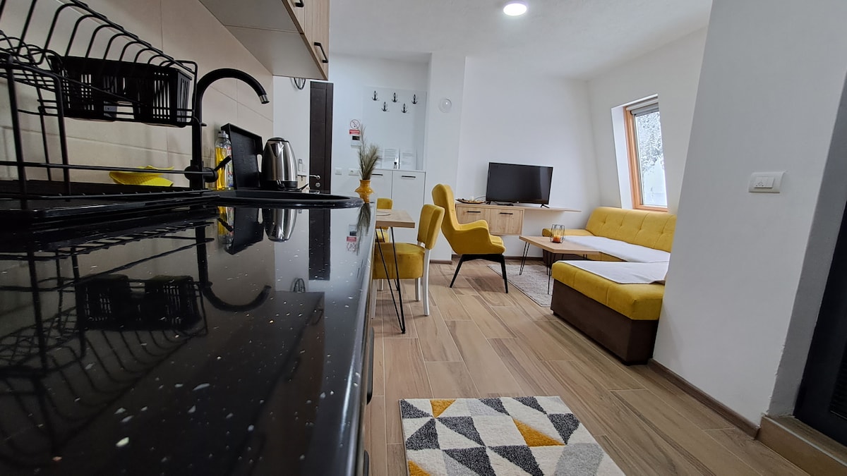 New apartment in Jahorina with a beautiful view of 4 surrounding mountains. It is located in the modern apart-hotel Zlatni Javor. It has one bedroom (double bed 160 cm), a sofa bed in the living room, a fully equipped kitchen, a heated ski room for 4 pairs of skis. It is near the ski slopes of Poljice. Hotel services are available to guests for an additional fee: swimming pool, transportation to the track and restaurant services. A grocery store is located nearby.