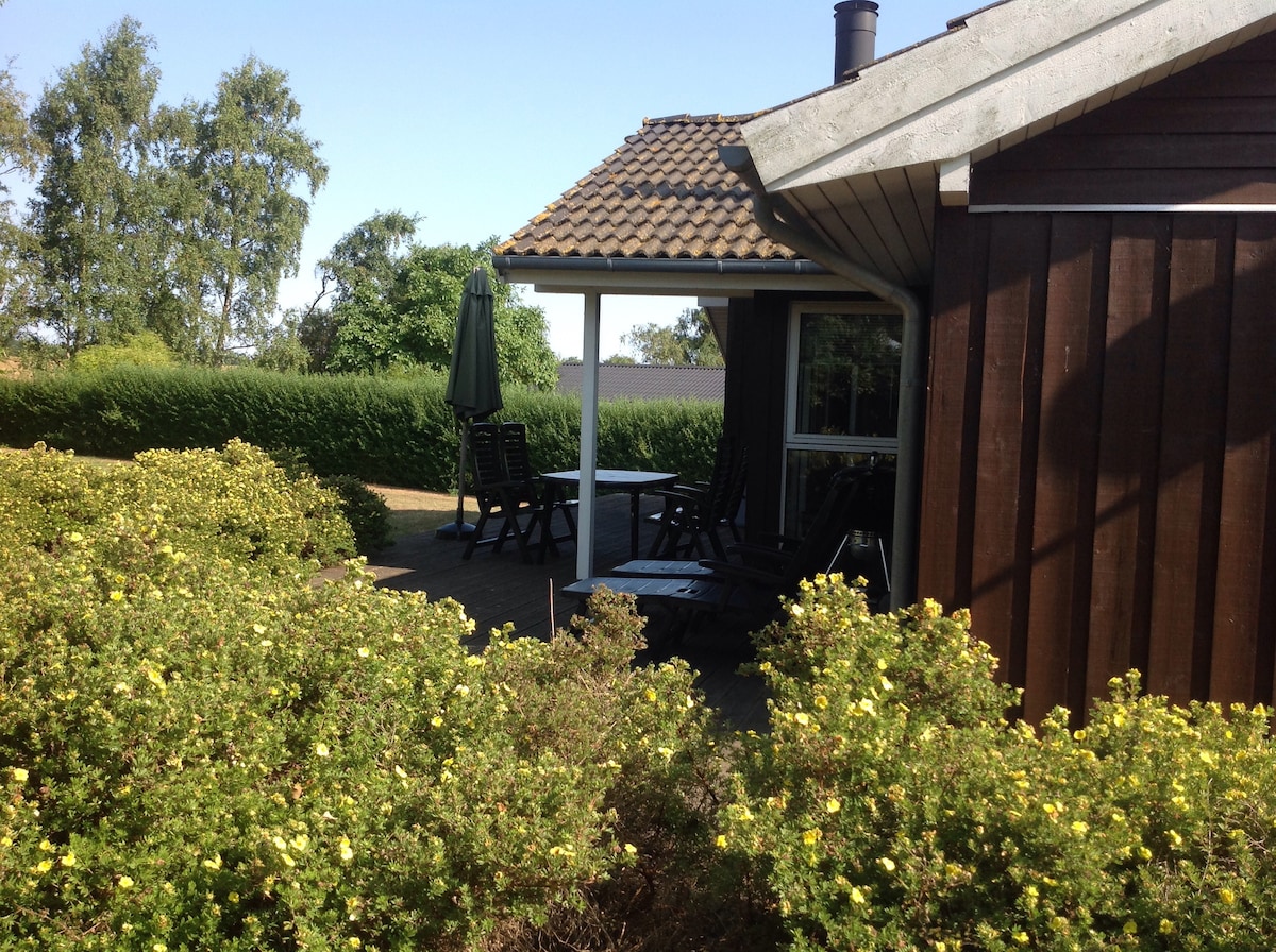 Beautiful cottage with a closed nature ground and view to the golf course. Only 400 meters away from the beach with jetty. The house is very light with a combined kitchen and livingroom. It has 3 bedrooms, 1 bathroom with sauna and 1 extra WC. In front of the house there is a beautiful 100 m3 porch. The cottage is equipped with a satellite-TV, DVD-player, WI-FI, microwave, washing machine and a tumble dryer in one. Futhermore there is an outdoor fishing cleaning space and a shed with a freezer.
