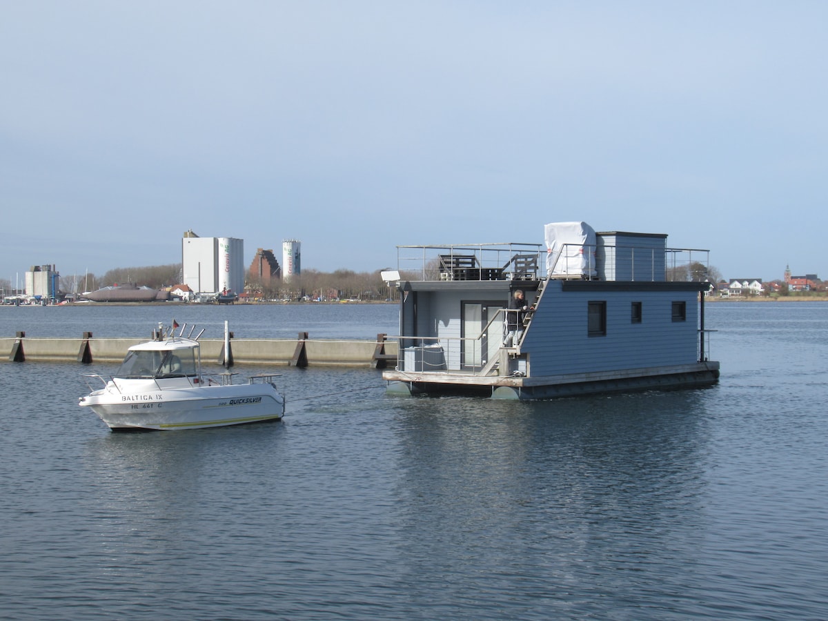 Schwimmendes Ferienhaus mit zwei Schlafzimmern für den Urlaub am Meer... direkt am Strand und Wasser. Geschützt durch die Mole im Großenbroder Binnensee ist man dem Ozean, dem Wind, der Sonne und dem Horizont so nah, wie man es sonst nur auf einem Boot sein kann. Den Abend mit einem weitschweifenden Blick über die Ostsee ausklingen lassen. Beobachten, wie die Yachten nach ihren Ausflügen zurück in den Yachthafen schippern. Das Meer riechen und genau dort bleiben dürfen.