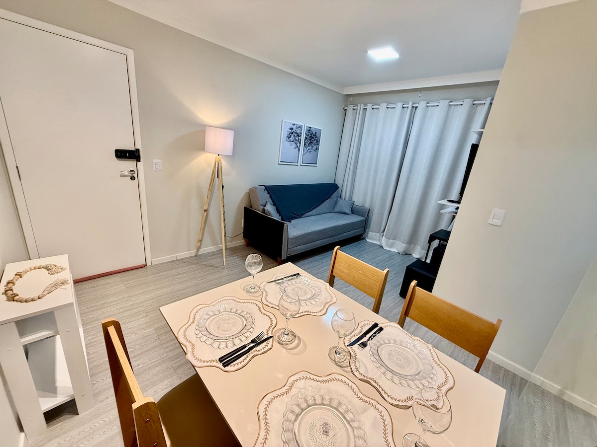Apto composto por: Sala ampla, painel com TV, WI-FI, Sofá-Cama, mesa e cadeiras;cozinha com fogão e gás canalizado,geladeira,armários; área de serviço;quarto de casal,ar condicionado,guarda-roupa amplo; quarto de solteiro com 2 beliches, guarda-roupa,escrivania para computador. Condomínio com piscina e área de lazer interna.Ótima localização: próximo a grandes supermercados, delicatessem, panificadora, farmácia, shopping, bancos, academia, churrascaria. Proprietário pronto para servi-los.
