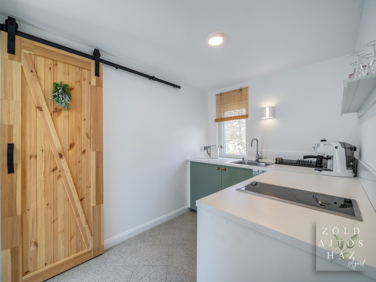 Come and relax in our peaceful and newly remodeled guesthouse. One bedroom with double bed, one bathroom and a small room with a tiny kitchen (full) and a pullout sofa. Washer and drier in the bathroom. Main room has air conditioning. Assigned parking plus additional free street parking. Centrally located, walking distance to shops, restaurants and cafes as well as nature hikes. Bus stop is a 2 min walk, with buses going straight to Budapest. Budapest is about a 10 min ride/drive.