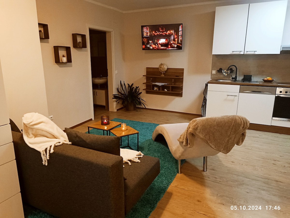 Ferienwohnung mit Sauna und Whirlpool! Herzlich Willkommen in dieser ruhigen & stilvollen Unterkunft im Landhaus Grünjuwel in Himmelberg/Kärnten. Auf über 80 qm können Sie Ihren Selbstversorger-Urlaub in ruhiger Lage genießen. Schlafzimmer mit Doppelbett, offene Wohn-Küche mit Schlafsofa (mit Lattenrost, Doppelbettgröße), großes Badezimmer mit Eckbadewanne, Walk-In Dusche & Doppelwaschtisch und Infrarotkabine, gemütlicher Vorraum und wunderschöne Holz-Terrasse. Platz für max. 4 Gäste.