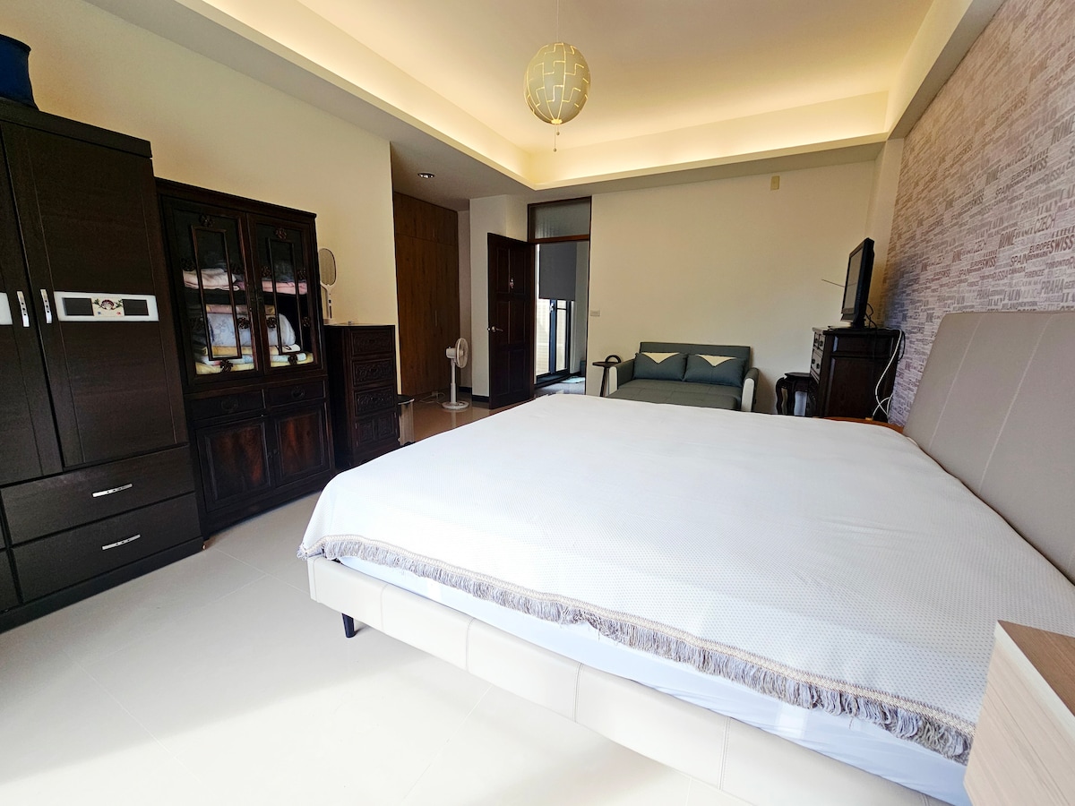 房間寛敞。新置換的加大雙人床及床墊,很好睡;另外有一張沙發床。獨立的陽台採光非常好,衛浴乾濕分離附大浴缸。 有梳妝台及電腦桌電視衣櫃等。 房間可供1-4人居住,但所報價格為「單人入住價格」,如有加人,每加一人多加300元。