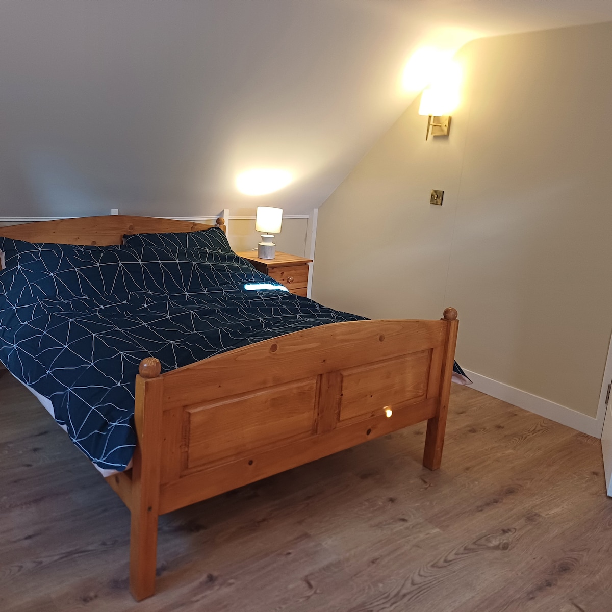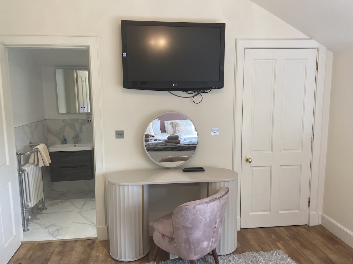 Large double bedroom with a dedicated working space and WiFi connection and tea making facilities. Outdoor balcony for relaxation and dining. Dedicated Ensuite off landing/changing area. over looking a mature wooded area and a short 10minute walk to the village
