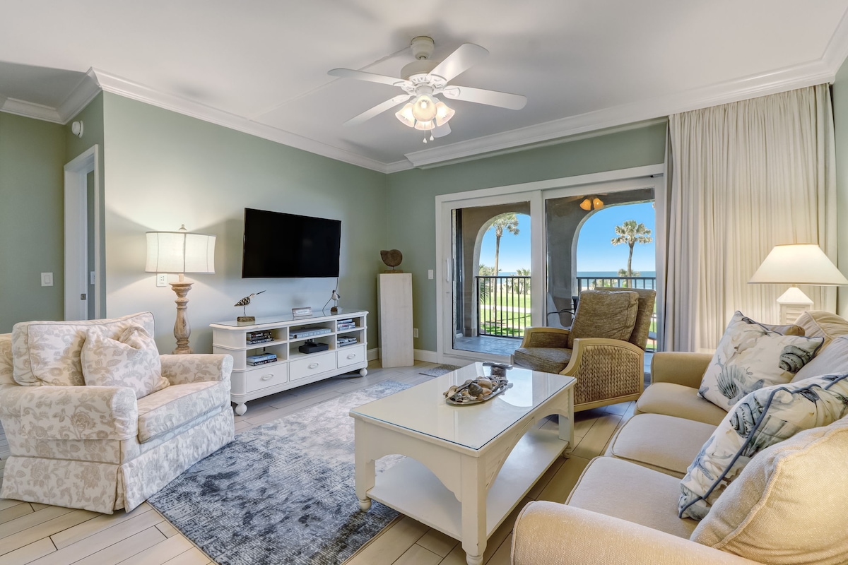 Bright & airy 2 bedroom corner unit. It is clean and beautiful & offers all the comforts of home. Living room opens up onto a 20 ft balcony which offers extended views of Fernandina Beach & is the best spot to watch the sunset over the ocean & dolphins playing in the waves. Master bedroom is ocean side & has a king bed. The kitchen is fully furnished allowing for meals at home. Beach towels, chairs and umbrellas included. Perfect for a romantic getaway, girls weekend or family vacation!
