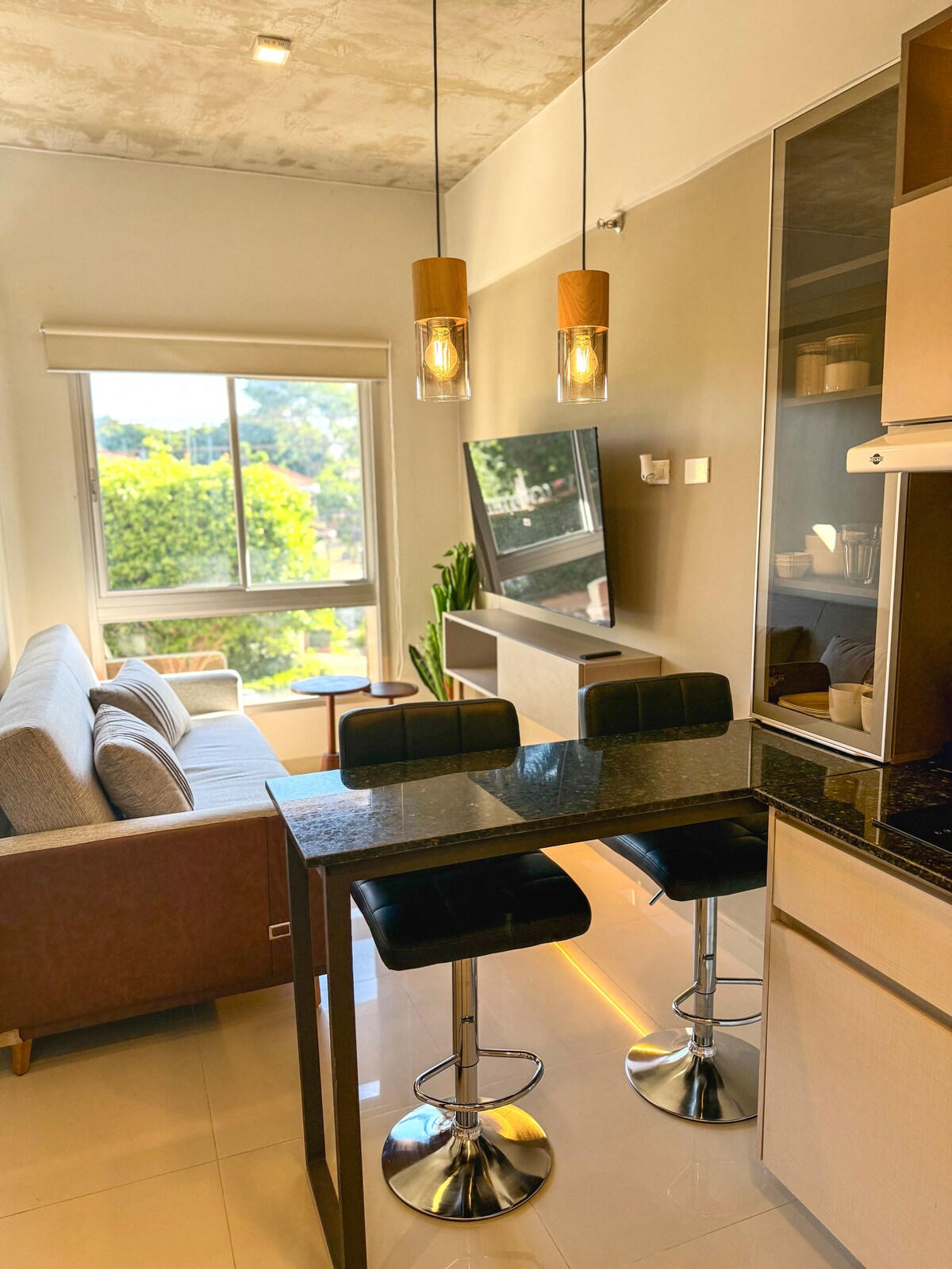 Monoambiente moderno, cómodo y con luz natural todo el día. Tiene balcón con vista abierta, ideal para relajarse o trabajar. Está bien ubicado, cerca de todo pero fuera del ruido del centro. El edificio ofrece pileta, gym, parrillero(pago), sala de reuniones con proyector y TV, salón de cartas, sala de niños con TV y área de lavado con máquinas. Equipado con aire, Wi-Fi, smart TV, cocina completa y escritorio. Ideal para estadías cortas o largas. Permite alojar hasta 3 personas.