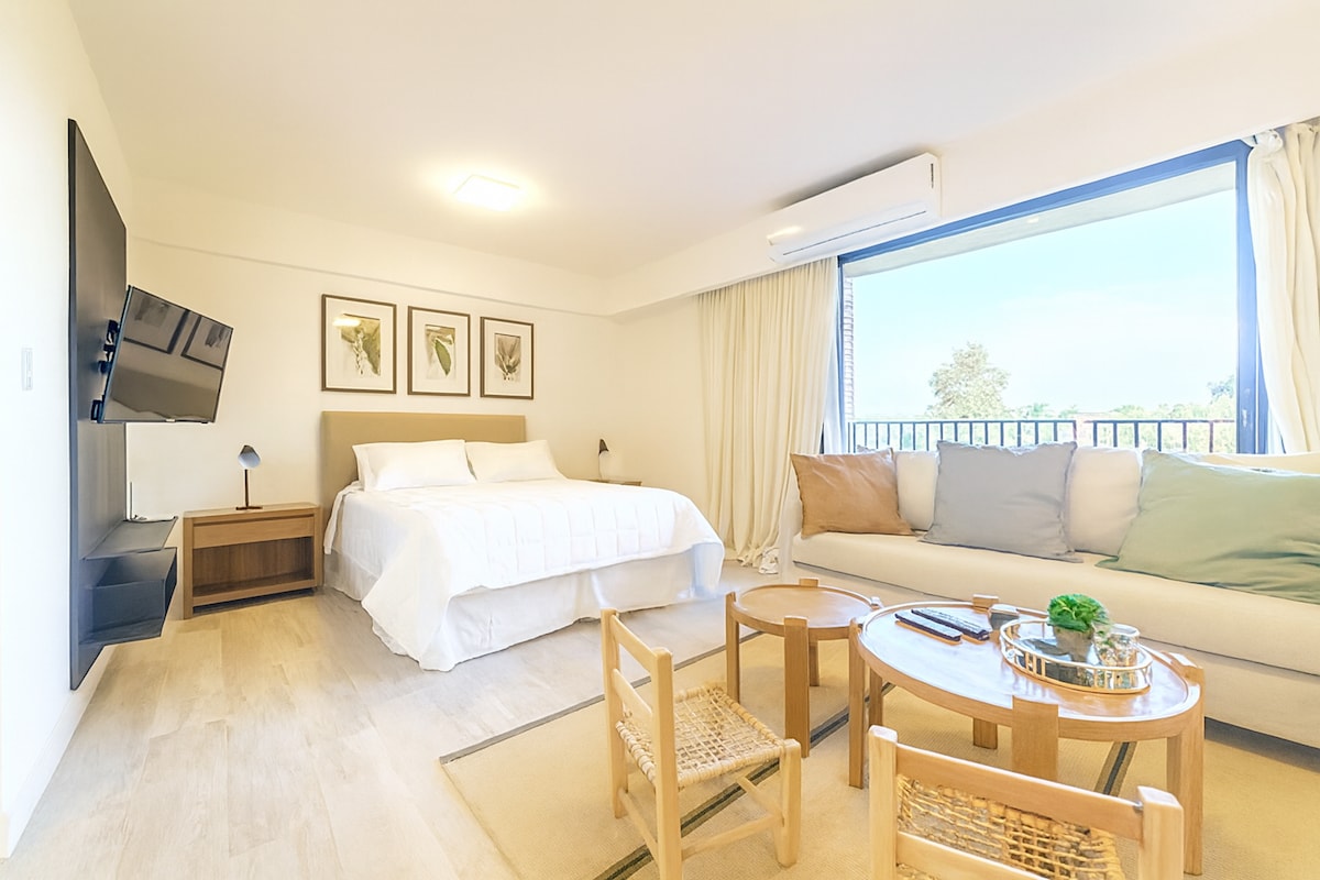 Monoambiente moderno, cómodo y con luz natural todo el día. Tiene balcón con vista abierta, ideal para relajarse o trabajar. Está bien ubicado, cerca de todo pero fuera del ruido del centro. El edificio ofrece pileta, gym, parrillero, sala de reuniones con proyector y TV, salón de cartas, sala de niños con TV y área de lavado con máquinas. Equipado con aire, Wi-Fi, smart TV, cocina completa y escritorio. Ideal para estadías cortas o largas. Permite alojar hasta 3 personas.