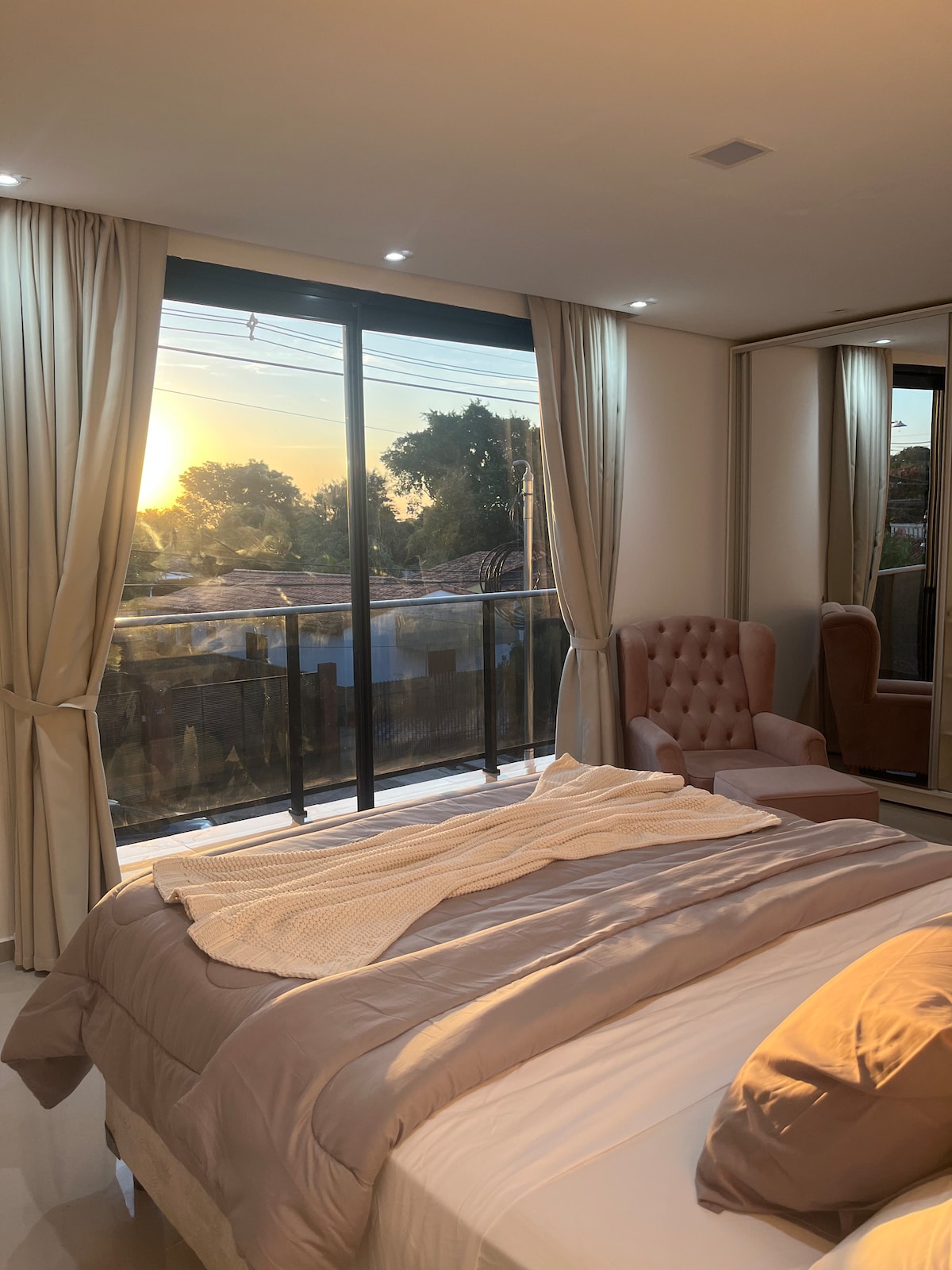 Departamento súper equipado en zona residencial, con balcón y parrilla, hermosa vista y amenities premium: - Piscina con solarium - Piscina climatizada - Sauna - Gym en altura - Rooftop + Quincho - Laundry - Seguridad 24hs - Cochera Excelente ubicación: - A 7 minutos del Eje Corporativo, Shopping del Sol y Paseo La Galería - A 10 minutos de la Costanera y el Puente Héroes del Chaco - A 15 minutos del Aeropuerto Silvio Pettirossi Cuenta con Wi-Fi, Smart TVs y colchones firmes de alta densidad