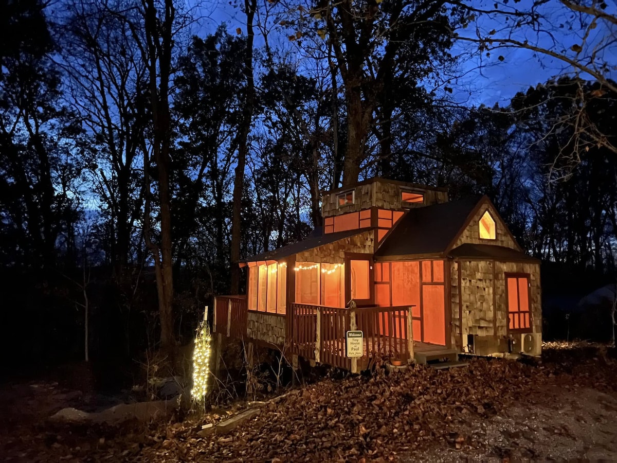 Perfect if you're working or spending time exploring Southern Illinois. Great discount for longer stays. Tiny House of Paul house has a cozy & spacious feel. A large west-facing window looks out onto the forest. Windows in the loft open to tree tops & stars. Private inside. Centrally located on the property of Center For Lost Arts near Cobden, Illinois. Wander the trails at the end of a work day, or relax on the deck after hiking or exploring. Enjoy your time in Southernmost Illinois.