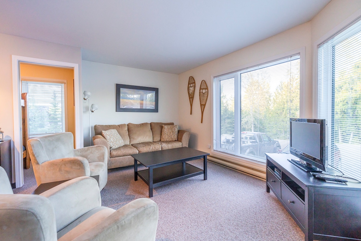 A fully equipped one bedroom condo 5 minutes from ski hill, 5 minutes from town, mountain bike trailheads close by. Great place to stage your adventures. Recreation activities within minutes: World class fly fishing, golfing, hiking, kayaking, snowshoeing, ATV, snowmobiling.... Pool, hot tub, steam room and exercise room in complex. Underground heated parking, wifi, cable. Washer dryer in unit.