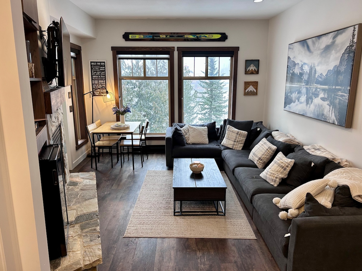 This quiet top floor suite surrounded by mountain views features a cozy living room, fireplace and sofa bed with multimedia centre to make your stay enjoyable. Main bedroom has a comfortable king size bed. We have a fully equipped kitchen and laundry for your convenience. Enjoy access to all amenities including underground heated parking, fitness room, pool, hot tub and steam room. Just 5 min from the hill and a short walk to restaurants & bars.
