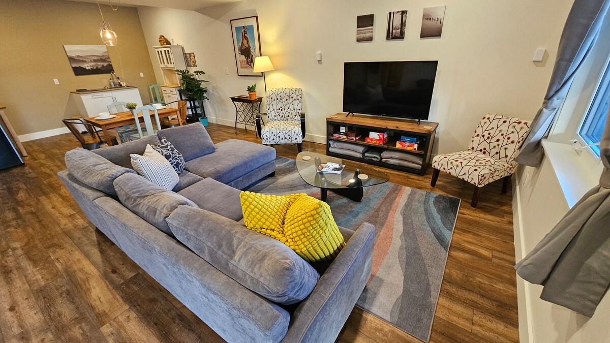 You will absolutely love our first floor studio with private deck and mountain range views! Our new studio, in the Montane subdivision of Fernie features a king bed, large kitchenette, toaster oven, private patio with BBQ and awesome views, Smart TV and a fireplace. There's storage for bikes and skies under the stairs in the entryway: feel free to use this space. Off road and street parking available. Please note, this is a family home with multiple units.