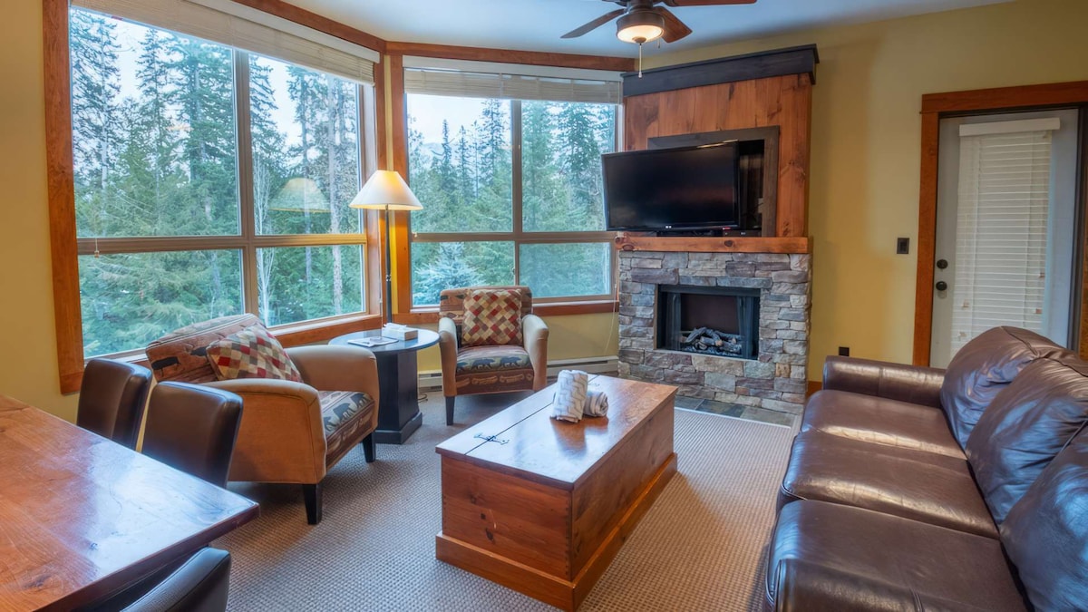 This quiet top floor suite surrounded by mountain views features a cozy living room, fireplace and sofa bed with multimedia centre to make your stay enjoyable. Main bedroom has a comfortable king size bed. We have a fully equipped kitchen and laundry for your convenience. Enjoy access to all amenities including underground heated parking, fitness room, pool, hot tub and steam room. Just 5 min from the hill and a short walk to restaurants & bars.