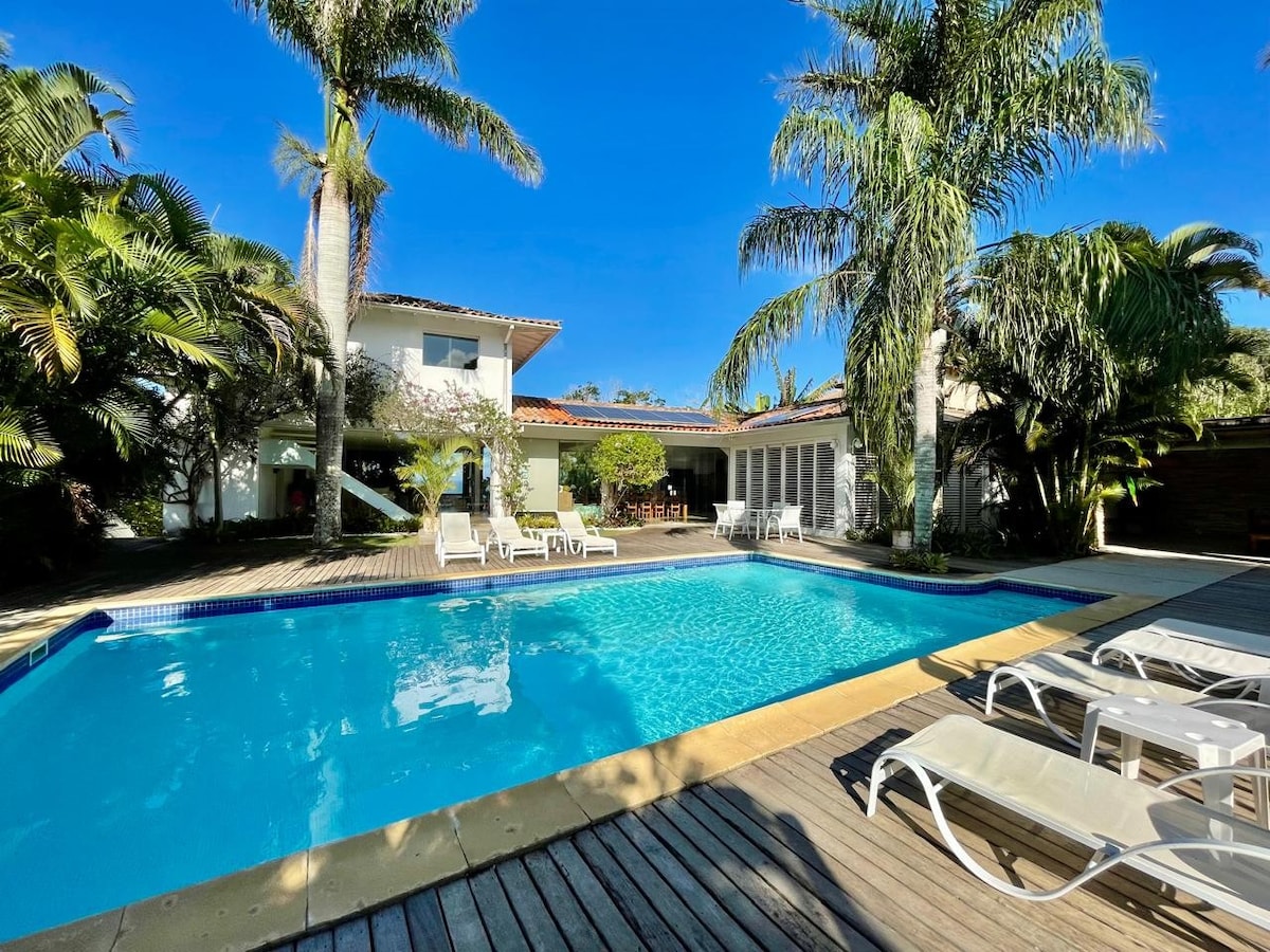 Enjoy this stylish and comfortable spot with your family at Manguinhos Beach, right on the sand. Take a short walk along the beach to reach a trail that leads to Tartaruga Beach, a beautiful destination, or stroll to Porto da Barra to enjoy the most popular restaurants in the area and relax with caipirinhas at sunset. For children, besides the heated pool and lawn, there is easy beach access from the house and even a small soccer field less than a five-minute walk away.