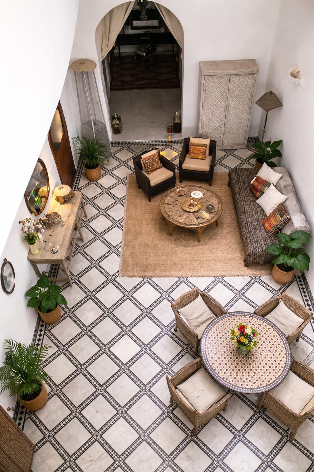 Yours alone. An entire small traditional Fassi home — private courtyard, two terraces, panoramic rooftop views over the ancient medina of Fez. This house was restored from a crumbling shell over a year by its British owner, working with master craftsmen from the Fez medina . The result is a home that is genuinely authentic, genuinely beautiful, and genuinely comfortable. It sleeps up to five guests in three double bedrooms and when you close the front door behind you, the whole house is yours.