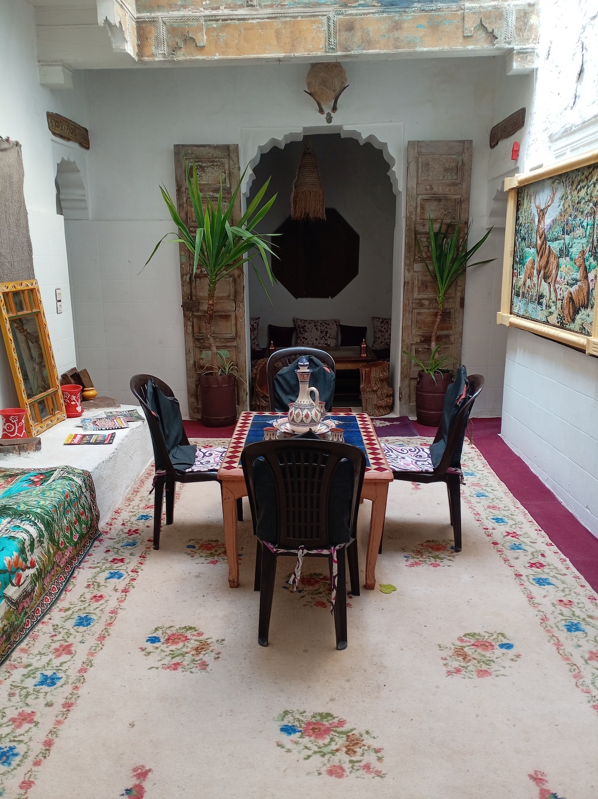 Belle maison de plus de 300 m2 disposant de chambres allant de 15 à 30 m2. Ce que l'on apprécie le plus après avoir pris possession des lieux et des volumes (hauteur sous plafond : 4m), c'est le silence régnant, le chant des oiseaux alors que de l'autre côté des murs la médina bouillonne. Le salon-terrasse offre une pause en extérieur et les transats font face aux chaud rayons du soleil.