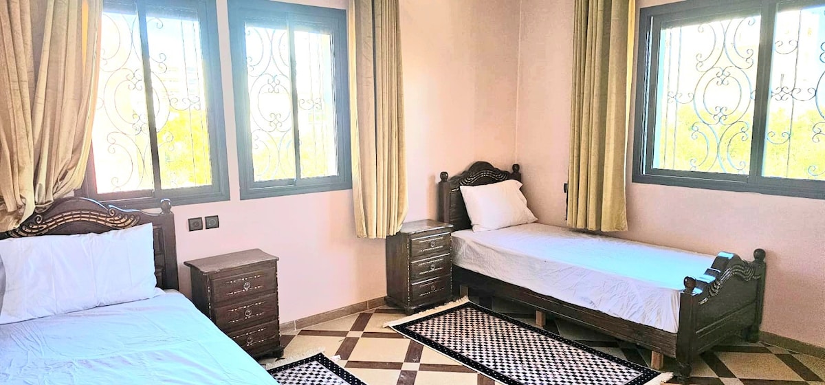 This stylish villa is perfect for group trips. This four bedroom villa offers 3 spacious living rooms! As well as two bathrooms. There is free parking on premises as well as day and night security outside the villa. grocery, vegetable, pastry shops are all a few steps away from the villa. The vila is a 10 min drive from Medina or to the centre. Don't delay, book Today!