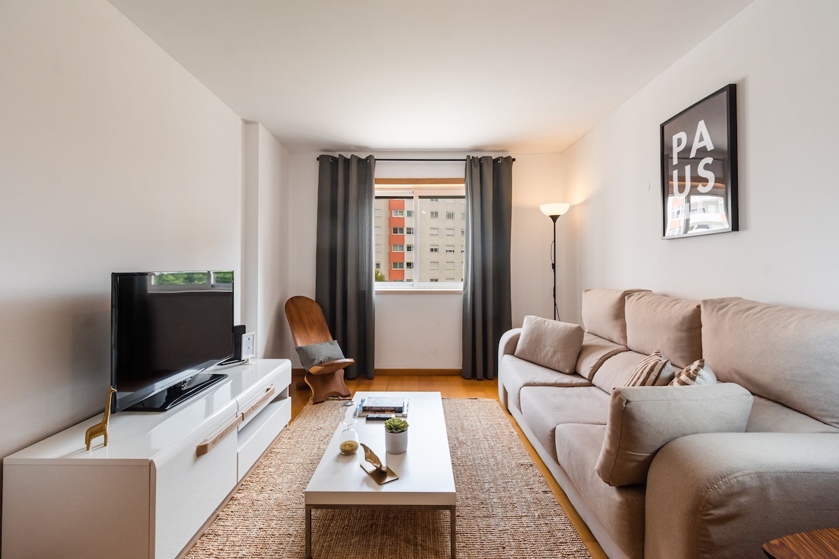 Welcome home! A cozy, bright and spacious 2-bedroom apartment near Lisbon Airport, Parque das Nações, Expo 98 site and Oceanarium! Ideal for families and groups of friends! The apartment is very spacious and welcoming and features an outdoor balcony and a cozy decor that will make you feel at home. It is fully equipped and inserted in a quiet and beautiful condominium with palm trees, kids’ playground area, bakery, free parking on site and located near two supermarkets.