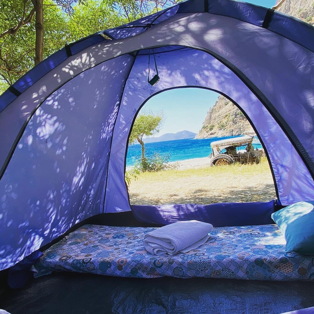 Glamp on the beach in Butterfly Valley, often listed among the Mediterranean’s most beautiful beaches. Reachable only by boat (7€ round trip from Ölüdeniz). Sleep steps from the sea in traditional tents with Wi-Fi, fan & outlets Enjoy daily yoga, waterfall hikes, diving and relaxed beach bars Days are lively, but mornings and evenings are peaceful with unforgettable sunsets, bonfire, music and stargazing Breakfast included Suitable for solo travelers, couples and families with children.