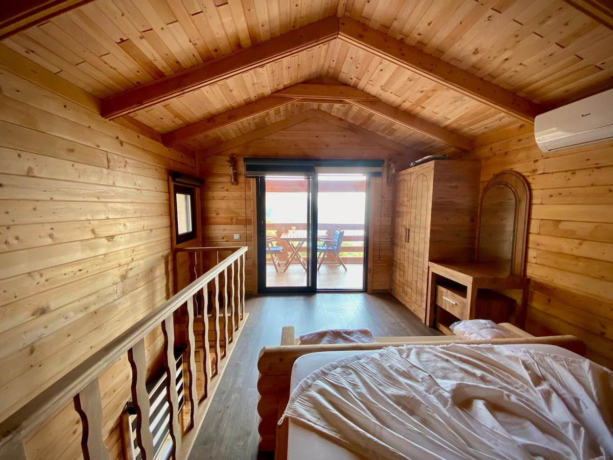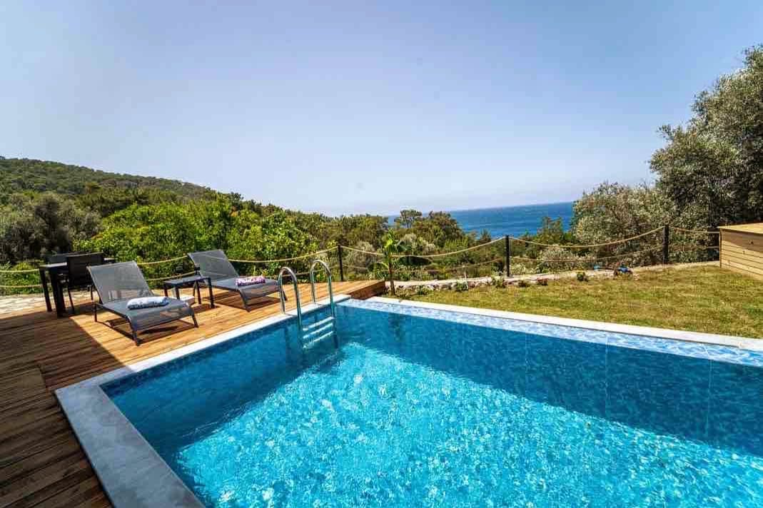 A wooden house in a 600 m2 garden that belongs only to you. It is completely surrounded and isolated. You will enjoy nature and tranquility with a 7mtx4mt pool, greenery and sea views. You will have a wonderful holiday in our house, which we designed with the most modern and finest details in mind. You will cool off under our private swimming pool and pergola made of special bamboos. A magnificent accommodation with a total of 56m2 patio and 1 loft floor awaits you.