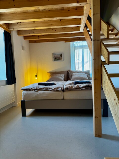 STUDIO, de 25m2 et mezzanine de 10 m2 sont situés sur le devant de notre maison. Il se compose d’une grande pièce avec bloc cuisine, table à manger, canapé-lit 2 places. Douche à l’italienne, WC. Une Mezzanine avec lit double. Ce studio est équipé : sèche-cheveux, fer/table à repasser, réfrigérateur, micro-onde, four, bouilloire, machine à café Nespresso, grille-pain et TV avec Swisscom-Box et WIFI. Place de parc. Possibilité de réduire les vélos dans un local fermé.
