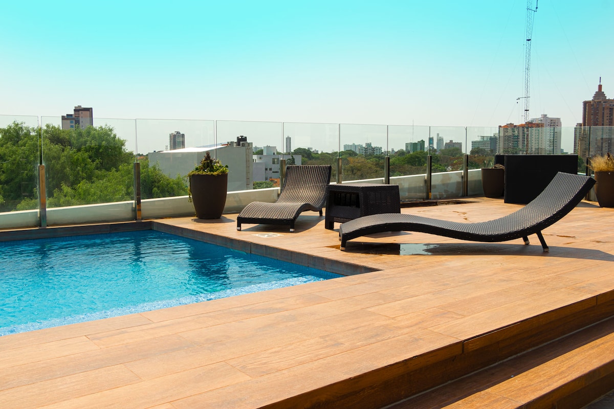 Diviértete en familia en este nuevo alojamiento céntrico y elegante. Hermoso y moderno departamento ubicado en la mejor zona de Santa Cruz. A tan solo pasos de los mejores restaurantes, farmacias, supermercados, cafeterías, discotecas y centros comerciales de la ciudad. Ideal para familias, un grupo de amigos o dos parejas. Podrán contar con todas las comodidades de un apartamento de lujo para poder pasar una estadía acogedora y agradable. ¡Las áreas comunes del edificio están de sueño!