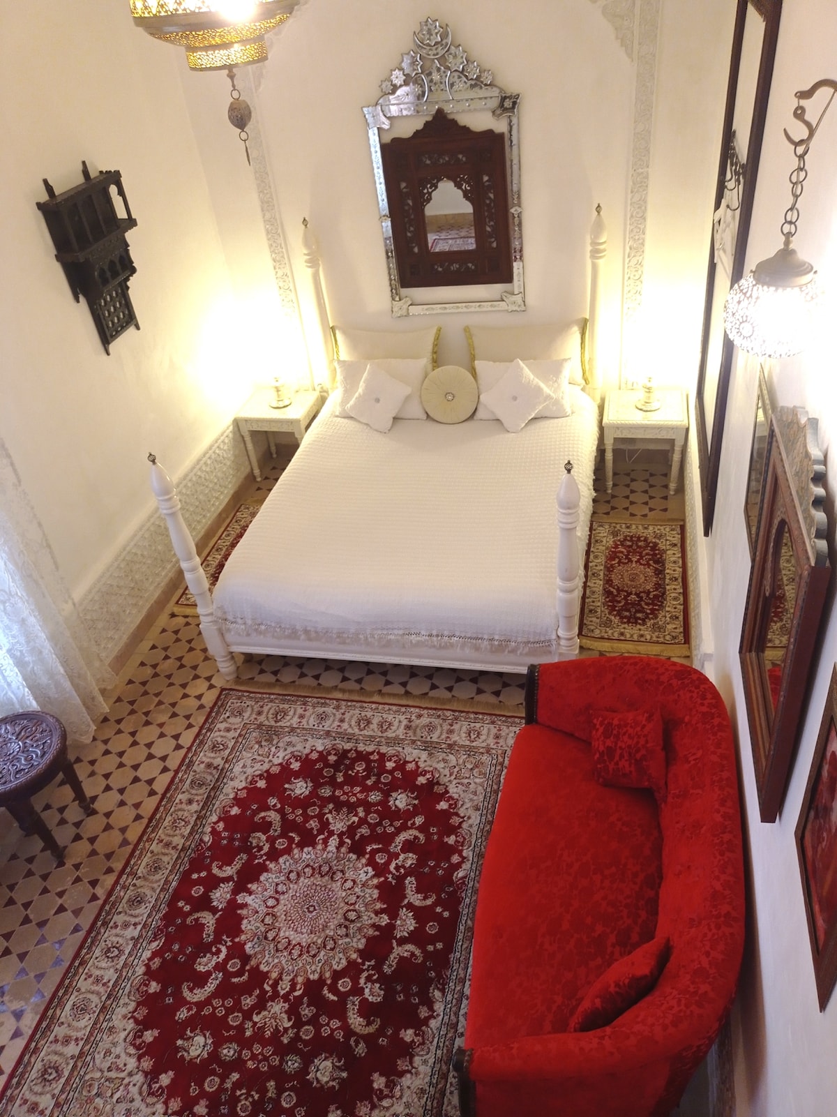 R´Mila Medina Fez is a small hotel with 6 rooms. Its a quit hotel, only for adults. This beautiful double en-suite room is situated on the first floor overlooking the plunge pool, it benefits from air conditioning in the summer months. It has an en-suite shower wc room