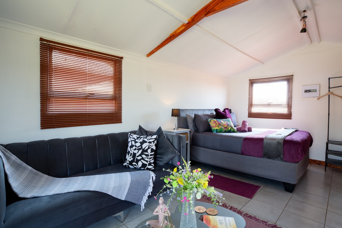 This double-story unit is separate from the guest house. This unit is suited to accommodate 6 guests and comes equipped with a double bed in one room, 2 x single beds in the second room and a sofa bed in the living room. The ensuite bathroom fitted with a shower.