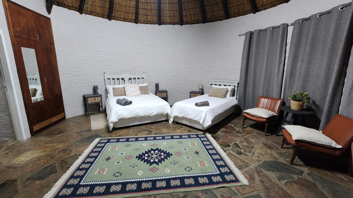 A modernized waterfront rondavel with 2 bedrooms featuring 2 singles / 1 queen beds, a bathroom with shower, a comfortable open plan lounge, dining & kitchenette. Patio with braai area and a breathtaking view of the dam.