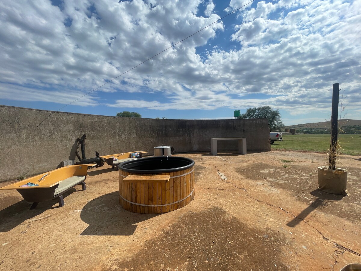 Experience the night sky under the stars by soaking in our wood fired hot tub. Our outdoor area is situated in a sucluded old water resservoir and lends itself to the open skies. The quant little house is completely off-grid but boasts all the necessary amenities to make your stay unforgettable; Free Wifi, hot water showers, Fire-pit and Hot-tub. This rustic experience also offers walking trails, private Vaal River access (1km from the house) and the renowned Ertjies Berg Cycle route.