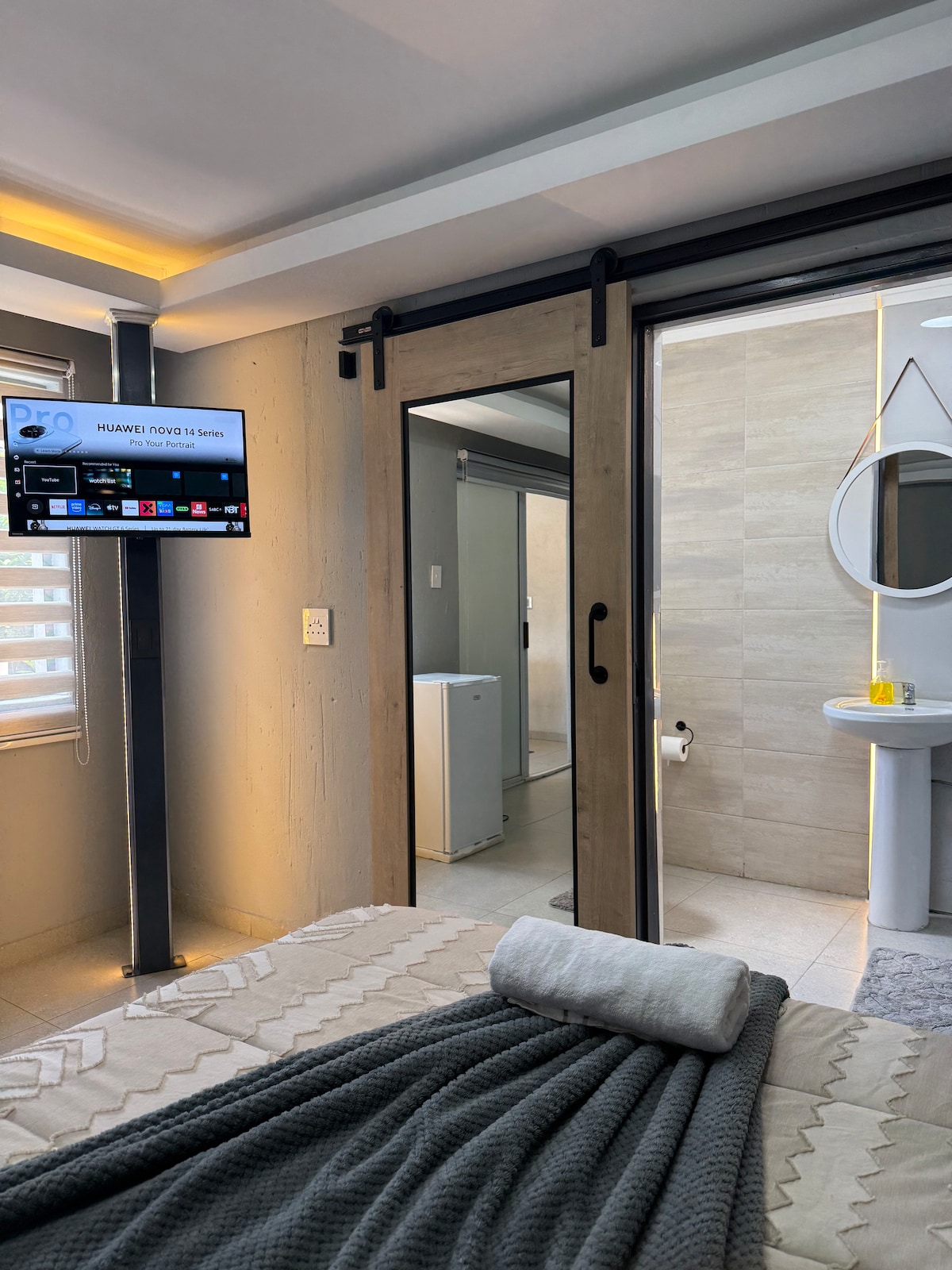 Kick back and relax in this calm and stylish space., with beautiful garden views and lots of windows for natural light. This room has a large HD smart TV so you have plenty of choices of what to watch. A Private modern bathroom and a nice kitchen space makes it perfect for a one night stay over or those looking to stay for a longer period comfortably. It has a sleeper couch, so could also be converted into a nice family room at extra cost.
