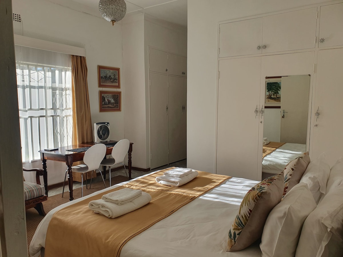 Keep it simple at this peaceful and centrally-located place. This Room has a King Sized Bed. It is private and features under roof parking, with remote access, right in front of your room. Load-shedding is not a problem with a dedicated inverter running some lights and super speed WIFI - ensuring you are never left in the dark!