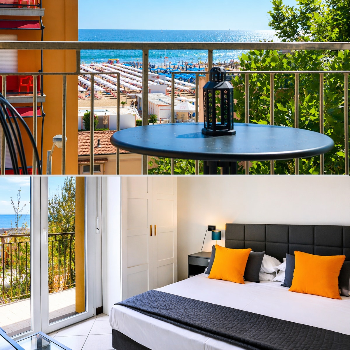 Appartamento con splendida vista mare, appena rinnovato sul lungomare di Rimini, a soli 10 m dalla spiaggia. Ampio soggiorno con divano letto matrimoniale, camera con letto King Size, cucina accessoriata con piano cottura, piatti, pentole, frigorifero e tavolo da pranzo. Climatizzazione autonoma in ogni ambiente, serrande elettriche, WiFi fibra ultraveloce, Smart TV in sala e camera, scrivania, cassaforte, bagno ampio finestrato con box doccia idromassaggio, specchio bluetooth con musica e phon.