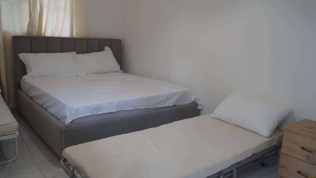 Modern, bright 2-bedroom apartment in the heart of Fier! One queen bed + two twins, sleek living room & fully equipped kitchen. Enjoy the washer/dryer, plus a beautiful balcony with outdoor dining and stunning city views. Just a 2-minute walk to downtown and close to supermarkets, shops, and restaurants—all within 10 minutes. Stylish, central, and perfect for families, friends, or business travelers. Experience Fier in comfort and style!