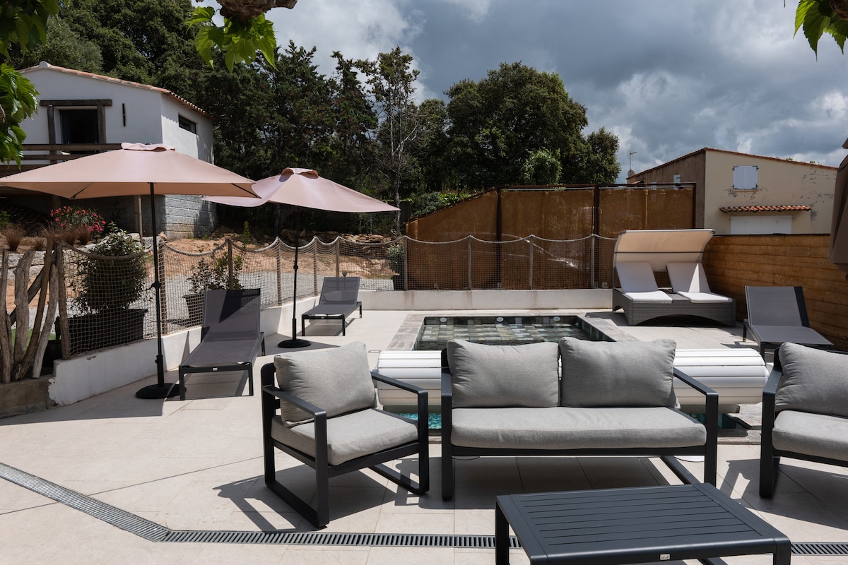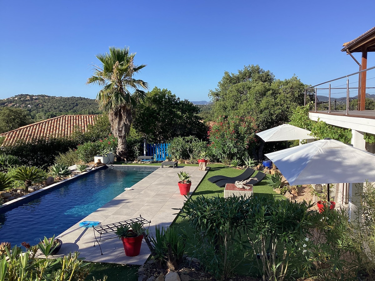 Bergerie **** in local stones and chestnut wood . In the Corsican forest, near the beaches and Porto Vecchio, you enjoy a splendid mountain view from the private heated pool and three terraces on a plot of 2000 m2 planted with trees Every detail has been designed for the pleasure of the eyes and comfort, furniture made by local craftsmen ,stone floor, high comfort bedding . The air conditioning and heated pool( may 2 to october 5 ) allow you to enjoy the house in any season