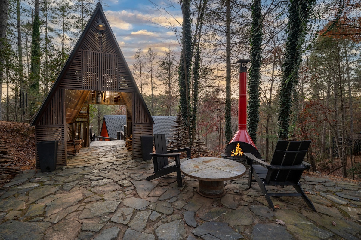 Creekside A-frame Treehouse in nature tucked amongst the trees in the scenic mountain town of Blue Ridge, Georgia. This treehouse is tiny home perfect for nature lovers, couples or solo adventurers. Inside this tiny cabin you will find custom construction with reclaimed wood from a 100 year old furniture store with rustic and modern charm. Outside, you will be greeted by the babbling of Fightingtown Creek, a large sunken hot tub overlooking the creek and a firepit under a canopy of stars.