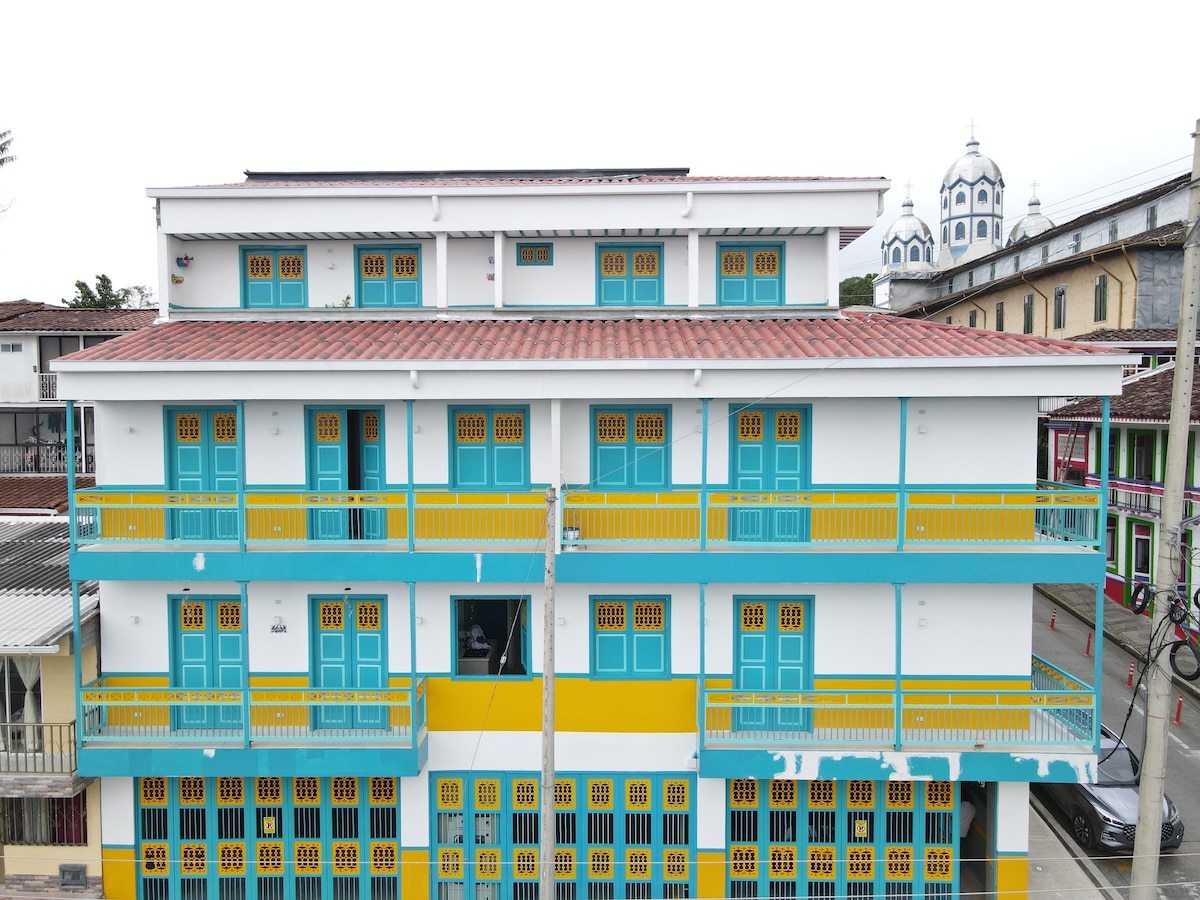Experience Filandia from this stunning new apartment with authentic Coffee-Region architecture, located in the heart of Colombia’s most beautiful town — just steps from the main square, the iconic church and the "Calle del Tiempo Detenido". Enjoy the perfect tradition and comfort: elevator, Smart TV, Netflix, 200 Mb WiFi, washer, L’Occitane amenities, fully equipped kitchen, King bed with duvet, hotel-quality linens, hot water, and electronic locks. Total comfort for an unforgettable stay.