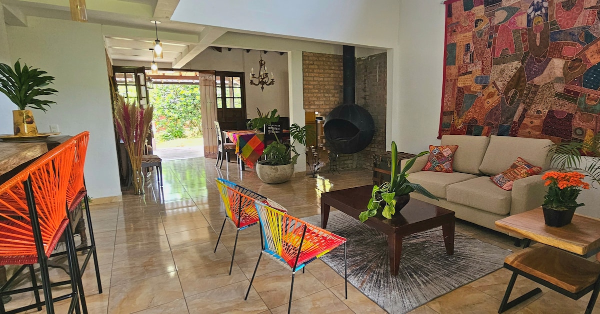 Casa campestre en Salento con terraza y kiosco junto al río con calentador exterior: un espacio mágico donde se escucha el agua y se respira tranquilidad. Cuenta con asador y chimenea para noches especiales. Ideal para familias o grupos que buscan comodidad, naturaleza y privacidad. Habitaciones amplias, camas confortables, cocina equipada, Wi-Fi y parqueadero. Perfecta para descansar y disfrutar del entorno.