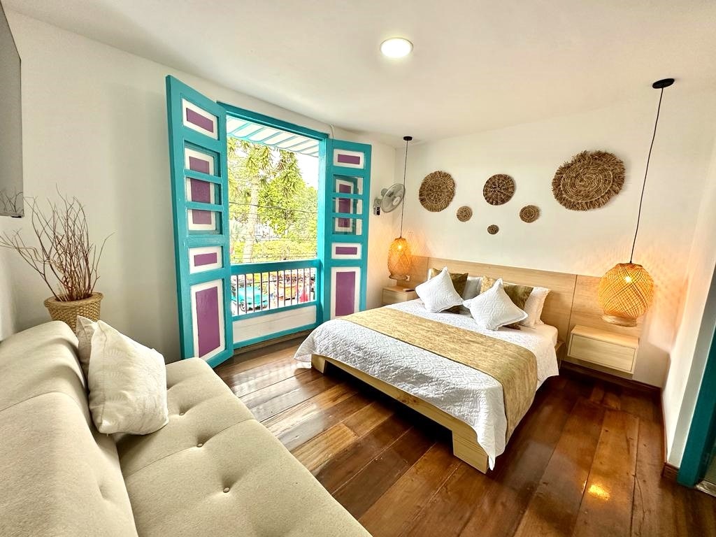 No querrás irte de este lugar tan único y encantador. Esta habitación es ideal para 2 personas, cuenta con cama Queen (1,60x1,90m), Sofa cama, baño privado, Tv pantalla plana, agua caliente y wifi. Ubicada dentro del Hotel Don Julio que se encuentra en el parque principal de Filandia. Resaltamos El Mirador, un lugar maravilloso para conocer. Adicional la Habitación tiene vista al parque principal.