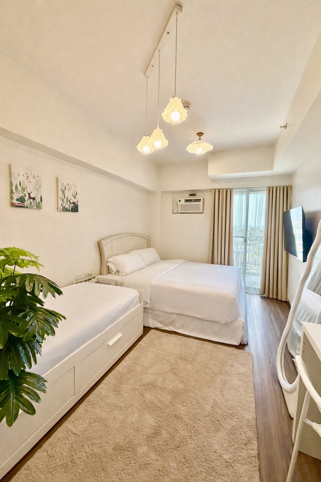 The space is a 38-sqm, one bed-room condominium, with balcony, overlooking a stunning 90-degree view of Alabang, Skyway, and the building’s pool area & lush garden - making it a balance of urban and green spaces. Great for staycation, as a work-from-home alternative, or for families wanting to relax and enjoy time being together. It is built unit with intricate details - spacious compared to a hotel room at the same price point. Our own basement parking is provided for guest/s at no extra cost.
