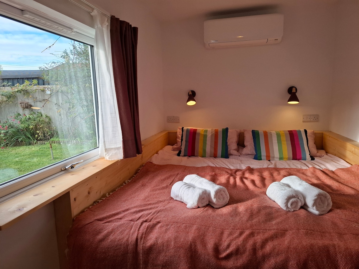 We recently transformed our large, 70 sq. meter, double garage into a stylish, open plan studio apartment with bleached oak, hardwood floor. It is a fantastic, light, and relaxing space with 3-meter bifold doors with integrated blinds that fully open out onto a shared courtyard with our house. There are large electric Velux sky lights with blackout blinds. It is a fantastic light space to relax or work. It has its own private access from the street.