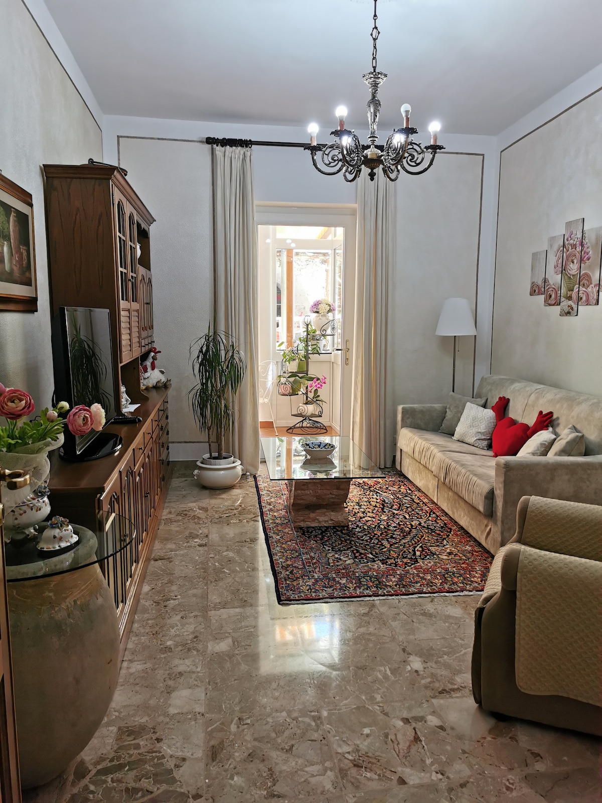 Codice CIN IT009056C2FFW2OJO6 Appartamento posto al primo piano in elegante villa d'epoca, nel verde e nella quiete, con terrazza attrezzata con ombrellone, tavolo, sedie su giardino privato, balcone, cucina completa di elettrodomestici e ogni occorrente, bagno con box doccia, ampio salone con divano letto matrimoniale e una poltrona letto singola, camera da letto matrimoniale. A disposizione degli ospiti macchina per il caffè con cialde, latte, biscotti, ampia scelta di marmellate, ecc.