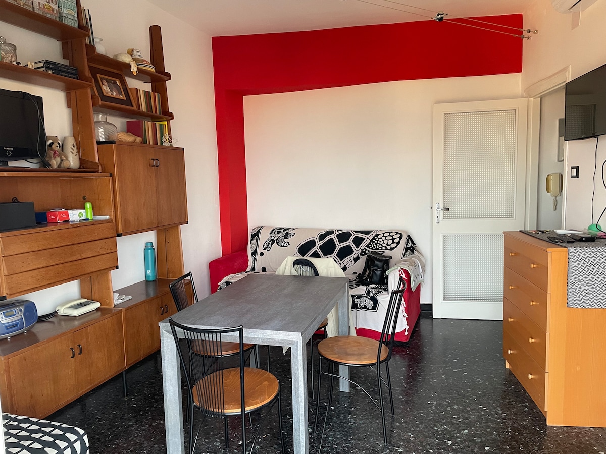 appartamento di mq 90, a 30 metri dalla spiaggia, in zona centralissima, comodo per la stazione, banche , posta, ristoranti, fermate dei mezzi pubblici. Due camere da letto con possibilità di aggiungere un terzo letto in ognuna, più ampia sala con divano letto. Terzo piano con ascensore. due balconi (uno con vista mare), wi-fi, due televisori, aria condizionata. Al piano terra ripostiglio per biciclette e possibilità di lavare e riparare le biciclette a 50 metri dalla struttura nel mio garage.