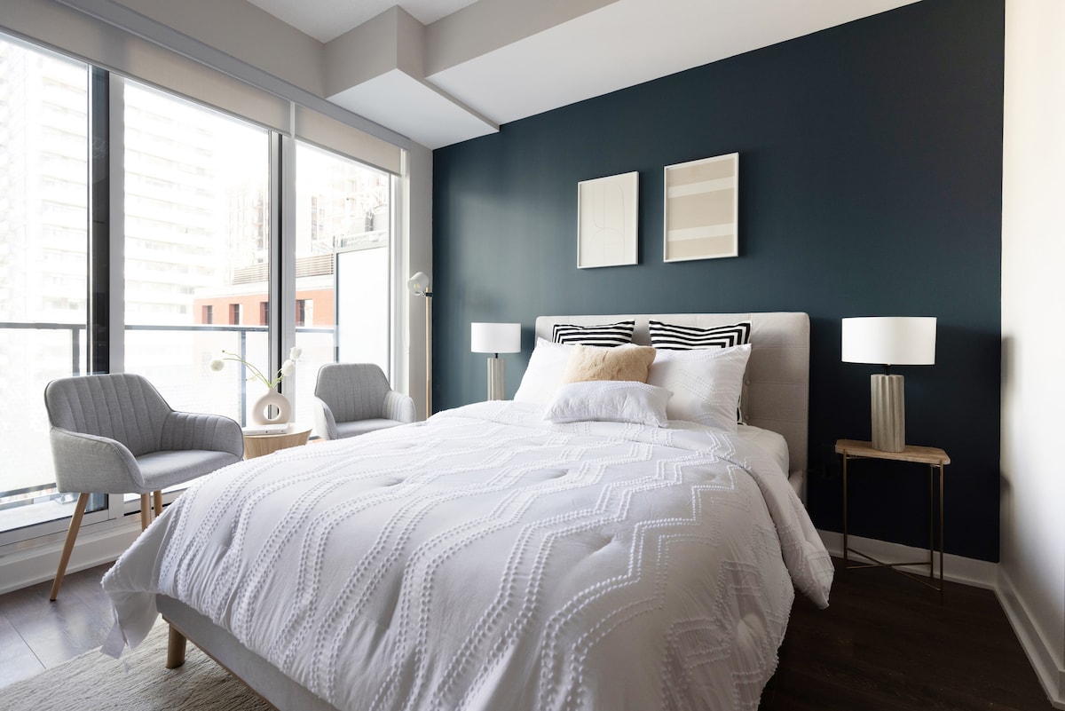 Welcome to your new home away from home! Perfectly-located in the heart of downtown Toronto and within walking distance to most coveted attractions, shopping, restaurants, coffee shops, clubs & bars. Features: → FREE parking → Fully-equipped kitchen → In-suite washer & dryer → 2BD each with comfy Queen bed → Living room w/ 65" TV, Netflix/DAZN → 1GB hi-speed internet for remote work → 10min walk CN Tower, Rogers Centre, Convention Centre, King St & Waterfront