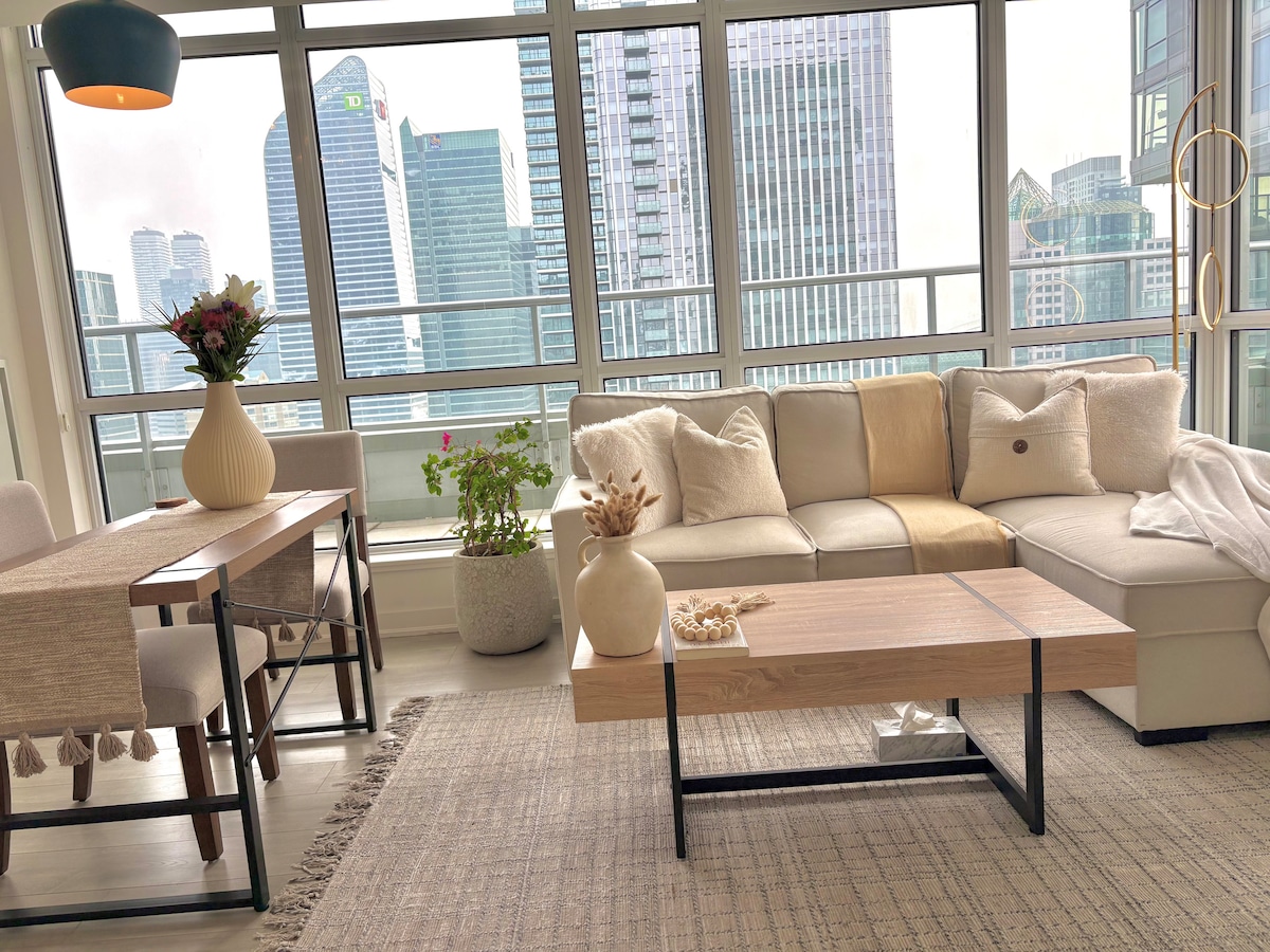 Luxury newly furnished home away from home in central downtown 300 Front Street with balcony CN Tower view. 2 Bedroom 2 Bath, Comfortable King bed TV en suit, Double bed TV w blackout curtains Enjoy in building Gym, Steam room, Outdoor pool with 360 degree view of the city, Whirlpool, and BBQ. Steps away from CN Tower, Rogers Centre, Aquarium, Metro Convention Centre, short walk to Scotiabank Arena, the lake, Bell Lightbox, Billy Bishop Airport, Union Station, Entertainment District and more