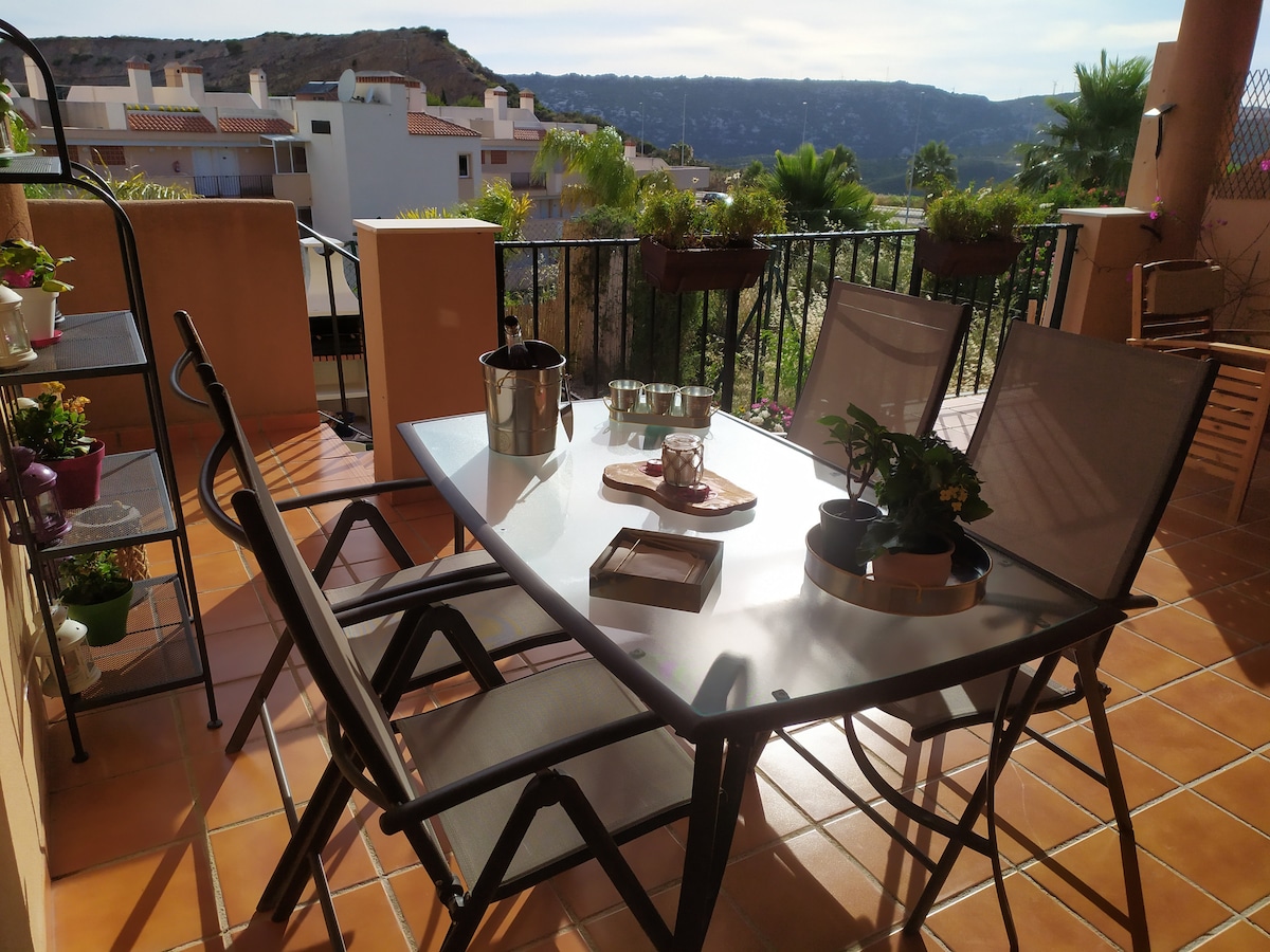 Relax in this spacious and quiet comfortable apartment, with its own 60 sqm terrace, right by the sea. "Sinfonia del Mar" is a very quiet and well-maintained apartment complex, with a fascinating panoramic view. The unique architecture with the large, partly covered terraces creates a good atmosphere in a prime location! You can quickly get through the garden to the footpath that leads along the sea. The swimming pool can be reached in a minute via the external staircase.