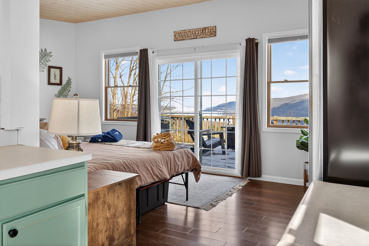 Nestled up on a hill overlooking Seneca Lake, watch the sunset while laying in bed or from your own patio with a fire crackling. We are local hosts and will make sure you have an unforgettable stay! Everything you could want to do in the Finger Lakes will be at your fingertips. Wineries galore, two even just next door, multiple breweries nearby, minutes to the lake, 15 minutes to downtown Watkins Glen, 10 minutes to hiking trails at the national forest, or stay in, relax, and enjoy the view!!