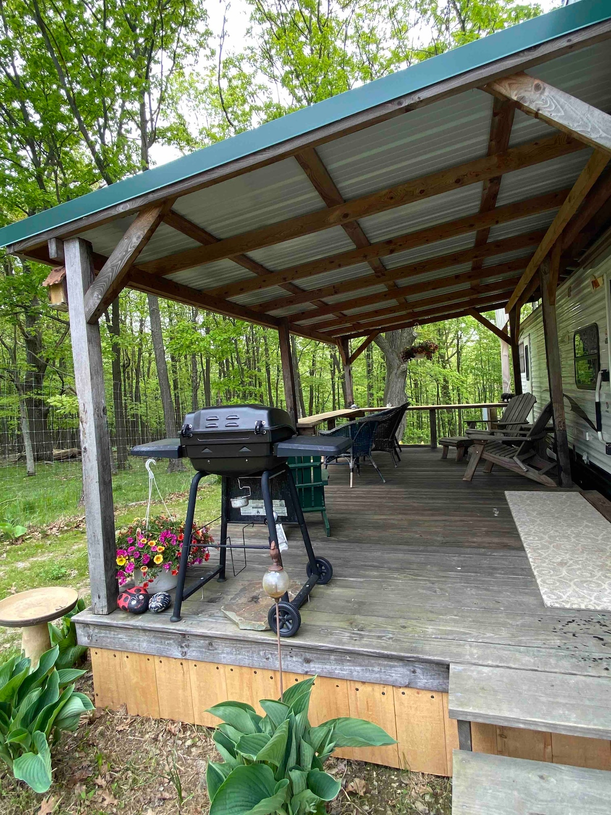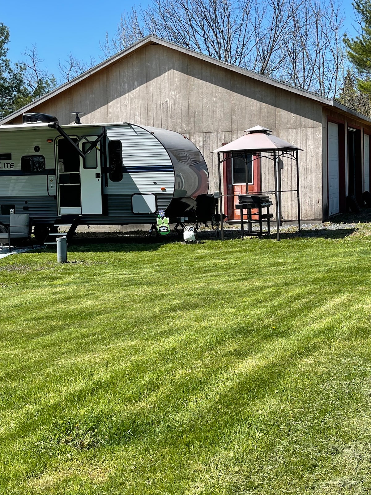 The Grapevine Getaway is a 30ft Modern Camper nestled in the woods. Sleeps 2 adults (Queen size bed) & 2-3 children (full size sleeper sofa) comfortably. Full deck, table, chairs & BBQ grill included. Relax around the campfire or take in the views with our walking path. Plenty of off-road / private parking. Electric, Sewer, Central Air, Refrigerator, Freezer, Stove, Oven, Microwave, Electric Fireplace & WiFi Incuded. A little piece of heaven centrally located between The Finger Lakes.